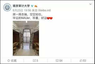 南京審計大學(xué)的孫宏斌老師,在朋友圈分享了一張照片,那張照片里,畢業(yè)生離校后的寢室,空空蕩蕩的,然而卻一塵不染。他寫下文字表明,這樣的畫面,比“揮一揮手,不帶走一片云彩”更讓人感懷。南審官博也發(fā)布了照片,還配文“揮一揮衣袖,空空如也。畢業(yè)生,珍重,好運”。