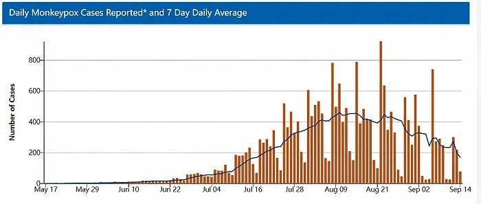 近期,美國新增病例增長速度有了減緩態(tài)勢。8月份時,病例翻倍所花時間是25天,然而7月份只需8天。到了本周,新增病例數(shù)量相較于8月高峰階段下降了50%。衛(wèi)生官員覺得,這是因為行為改變以及疫苗接種的推進,美國當(dāng)下已經(jīng)接種了46萬劑猴痘疫苗。